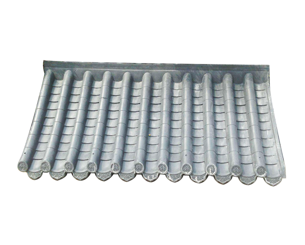 仿古瓦采用上下模具壓制成型,波紋大、外形美觀大方、立體感強、密度高均勻無異、尺寸嚴格準確、表面光滑平整,大于200公斤的抗折強度可以讓施工人員在已鋪設的屋面上行走自如。?